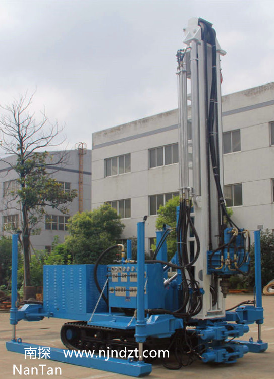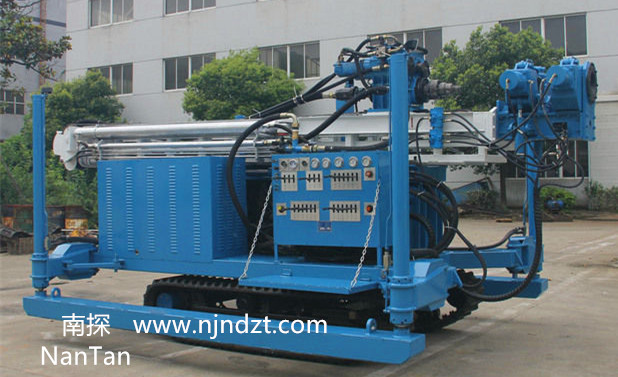 該鉆機最大特點為動力頭行程為5米,配備有大扭矩液壓馬達回轉、油缸推進及提升能力大。配有液壓伸縮隨手吊車和液壓卷揚機,減輕勞動強度。動力頭具有多種速度,使得鉆孔范圍更寬。液壓支腿行程大,不需吊車鉆機即可轉場裝卸。